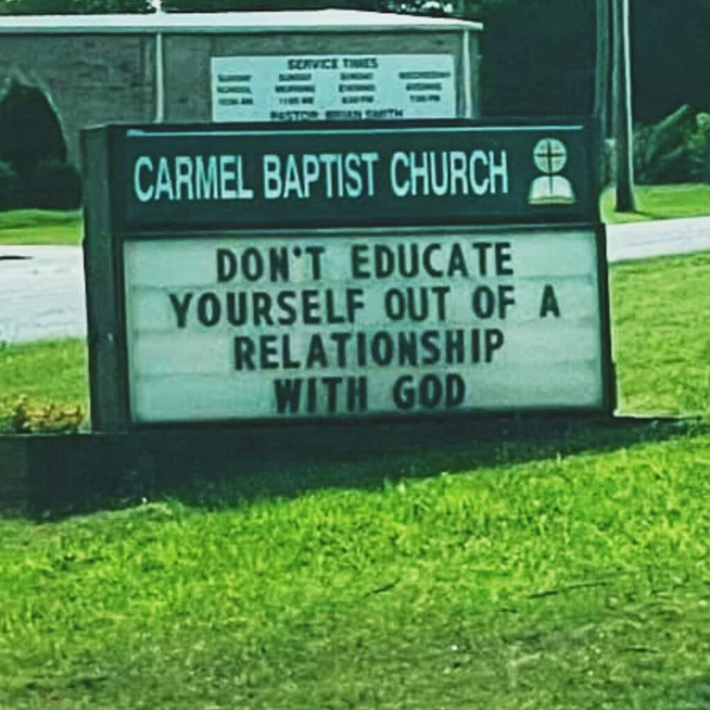 I appreciate that this friend was concerned for my well-being. His attitude toward secular education reminded me of a church sign I had seen: